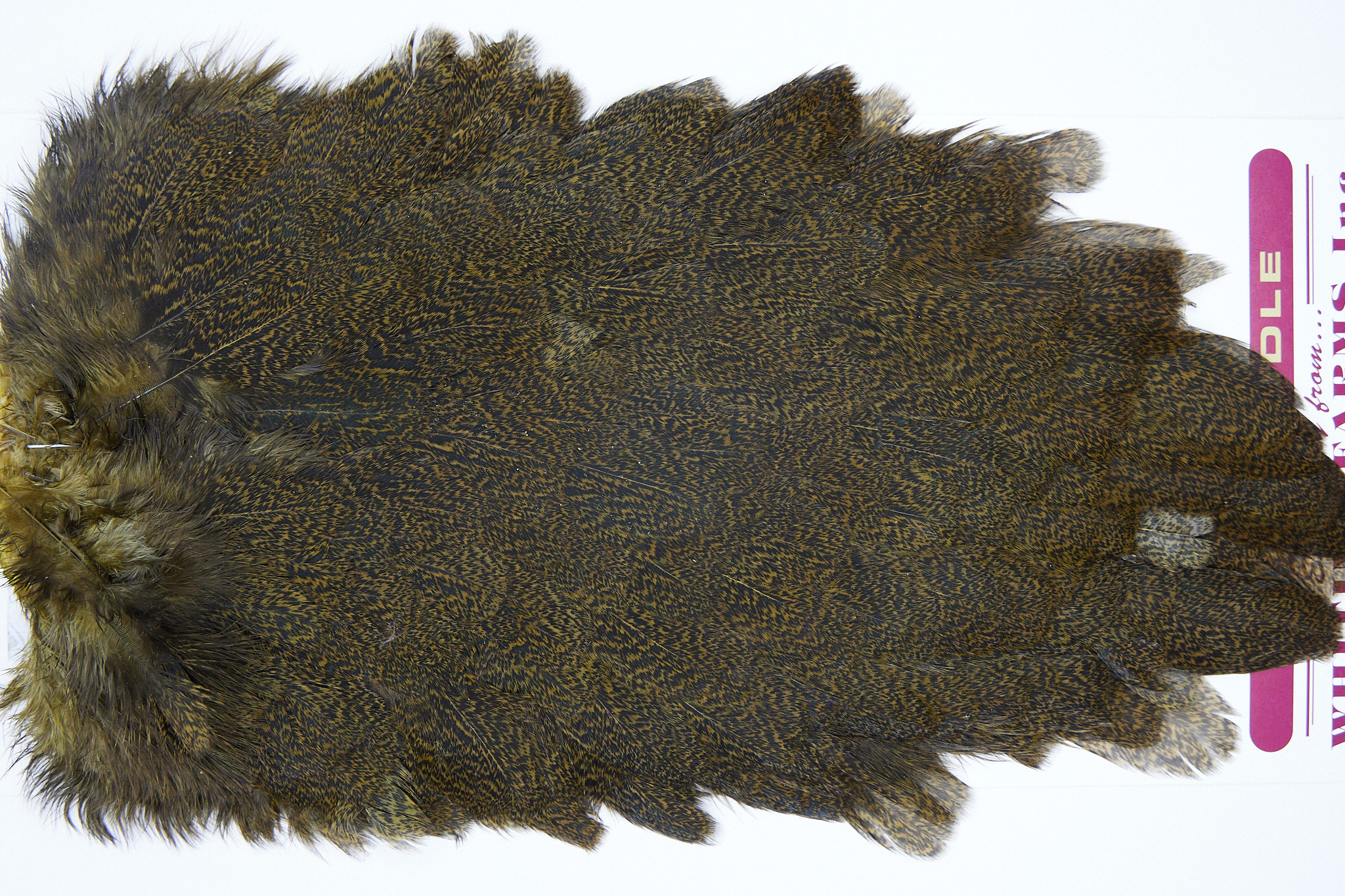 2705 is a Coq De Leon Hen Saddle of Golden Olive Speckled color. The image shown is an actual photo of this saddle. This is NEW UNUSED HACKLE.