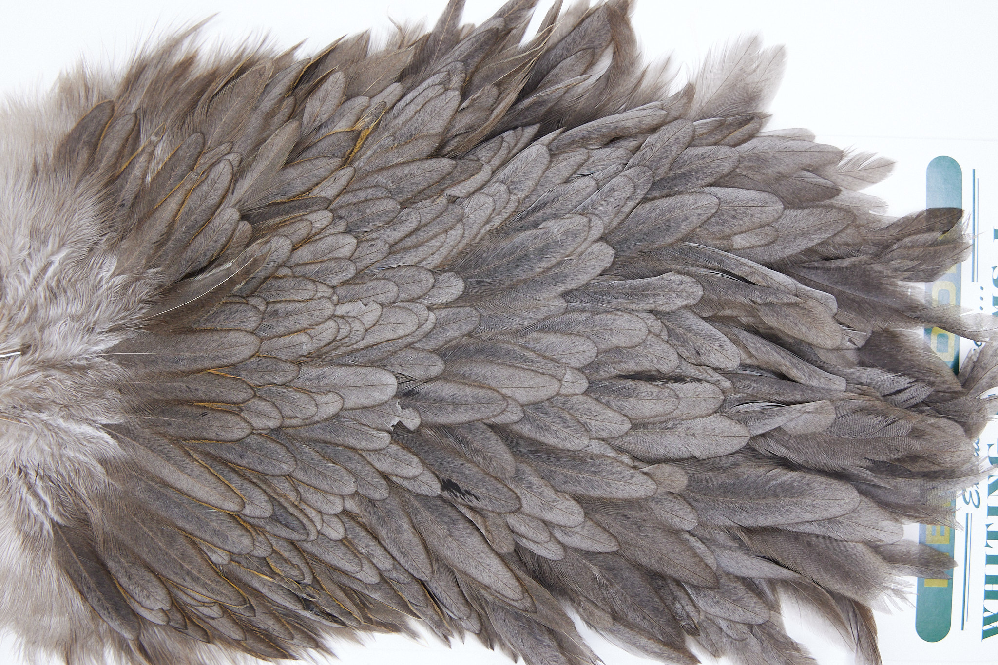 2748 is a Hebert Minor Hen Saddle of Dark Grey Dun color. The image shown is an actual photo of this saddle. This is NEW UNUSED HACKLE.