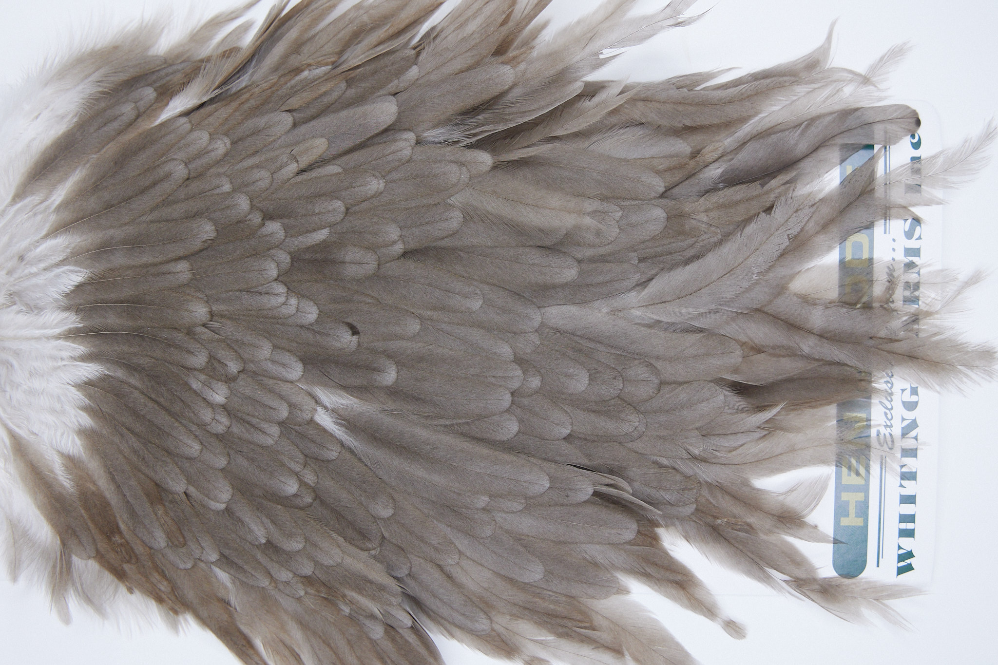 2749 is a Hebert Minor Hen Saddle of Dark Grey Dun color. The image shown is an actual photo of this saddle. This is NEW UNUSED HACKLE.
