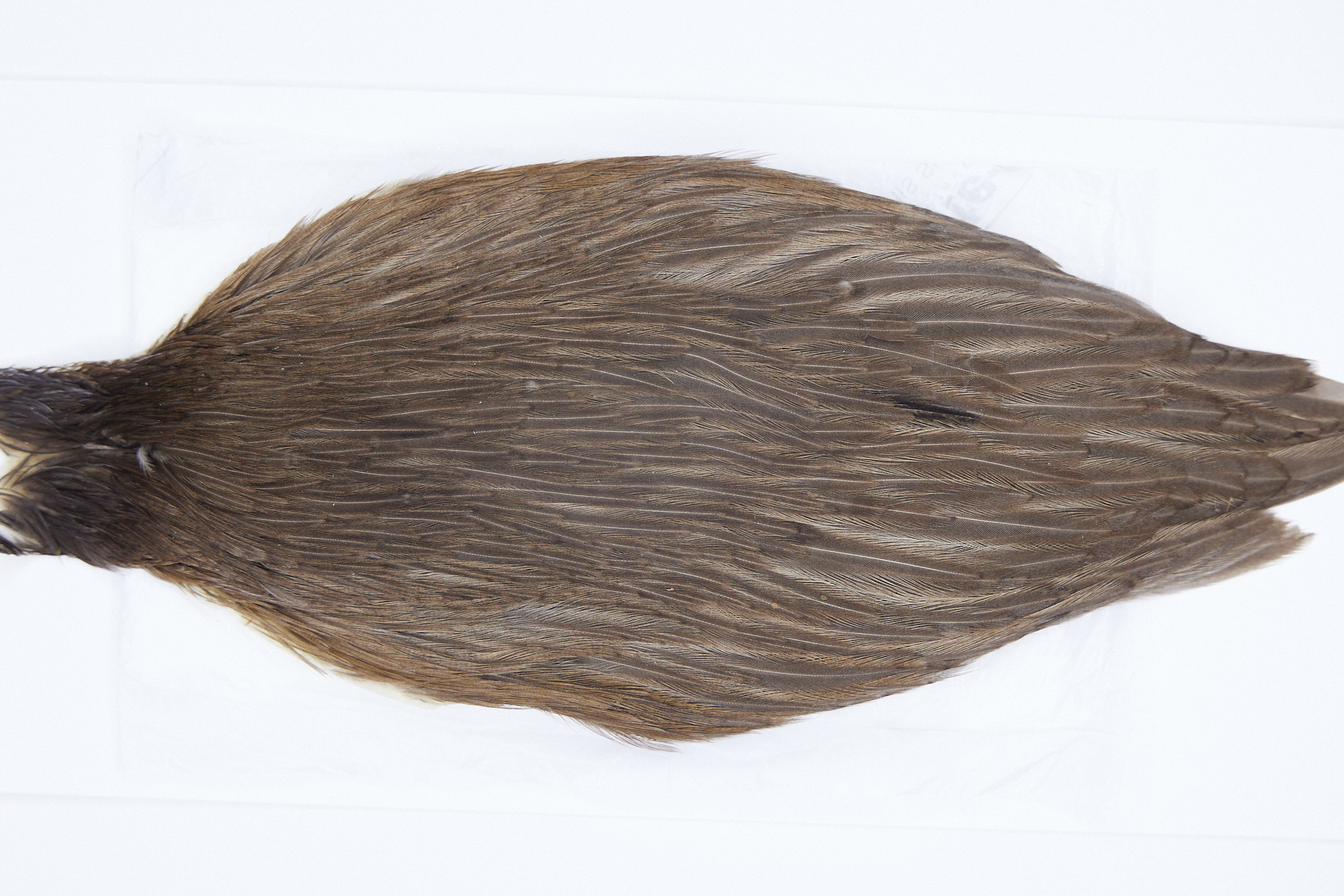 2801 is a Hebert Minor Hen Cape of Dark Brown Dun color. The image shown is an actual photo of this cape. This is NEW UNUSED HACKLE.