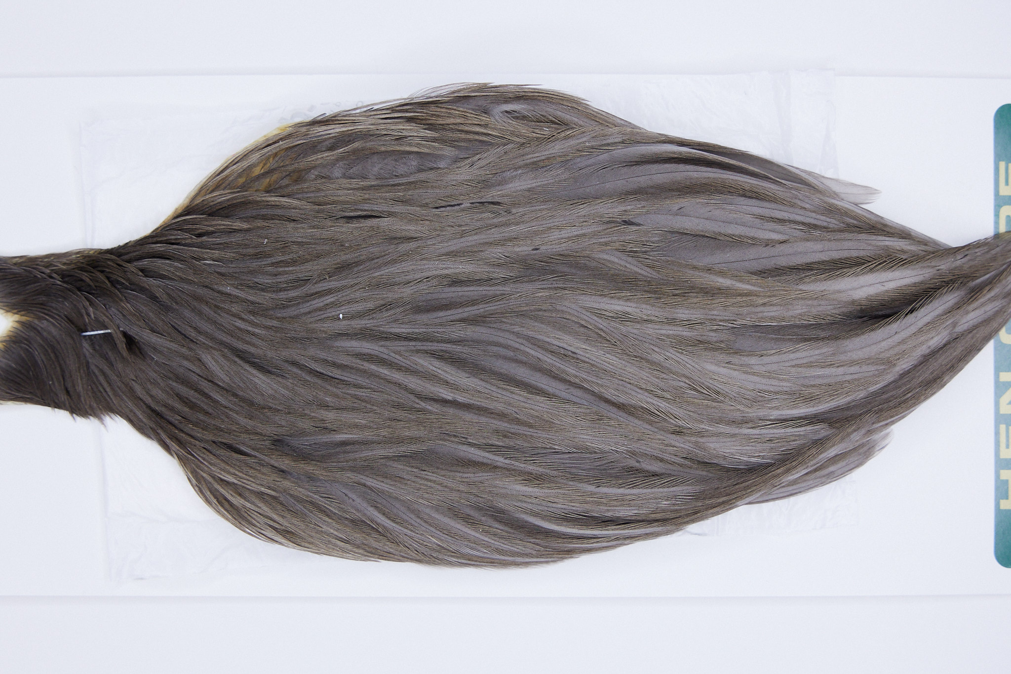 2818 is a Hebert Minor Hen Cape of Dark Grey Dun color. The image shown is an actual photo of this cape. This is NEW UNUSED HACKLE.