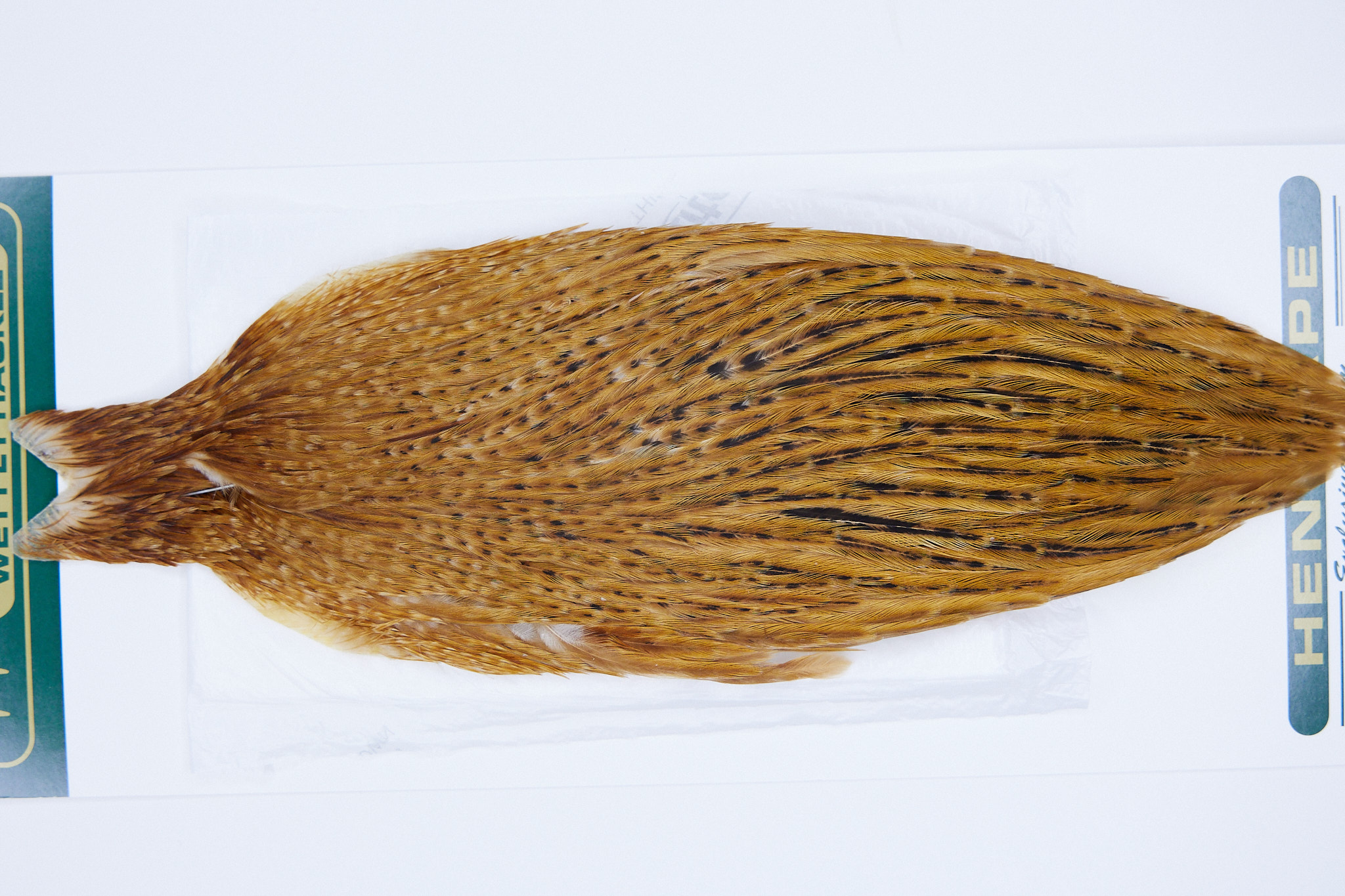 2841 is a Hebert Minor Hen Cape of Medium Ginger color. The image shown is an actual photo of this cape. This is NEW UNUSED HACKLE.