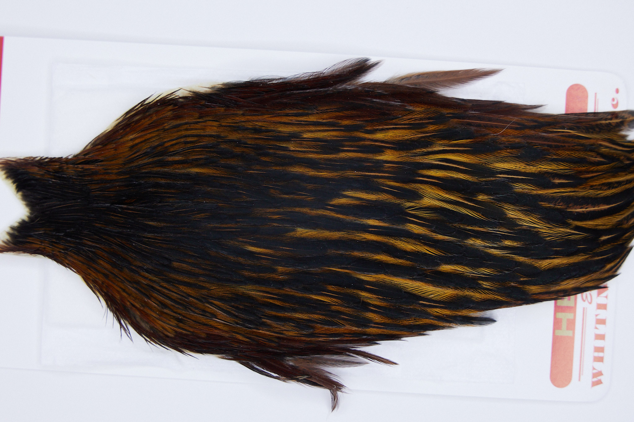 1975 is a Heritage 3 Grade Rooster Saddle of Heritage With Vermiculation color that ties predominately size 14-16. The image shown is an actual photo of this dry fly saddle. This is NEW UNUSED HACKLE.
