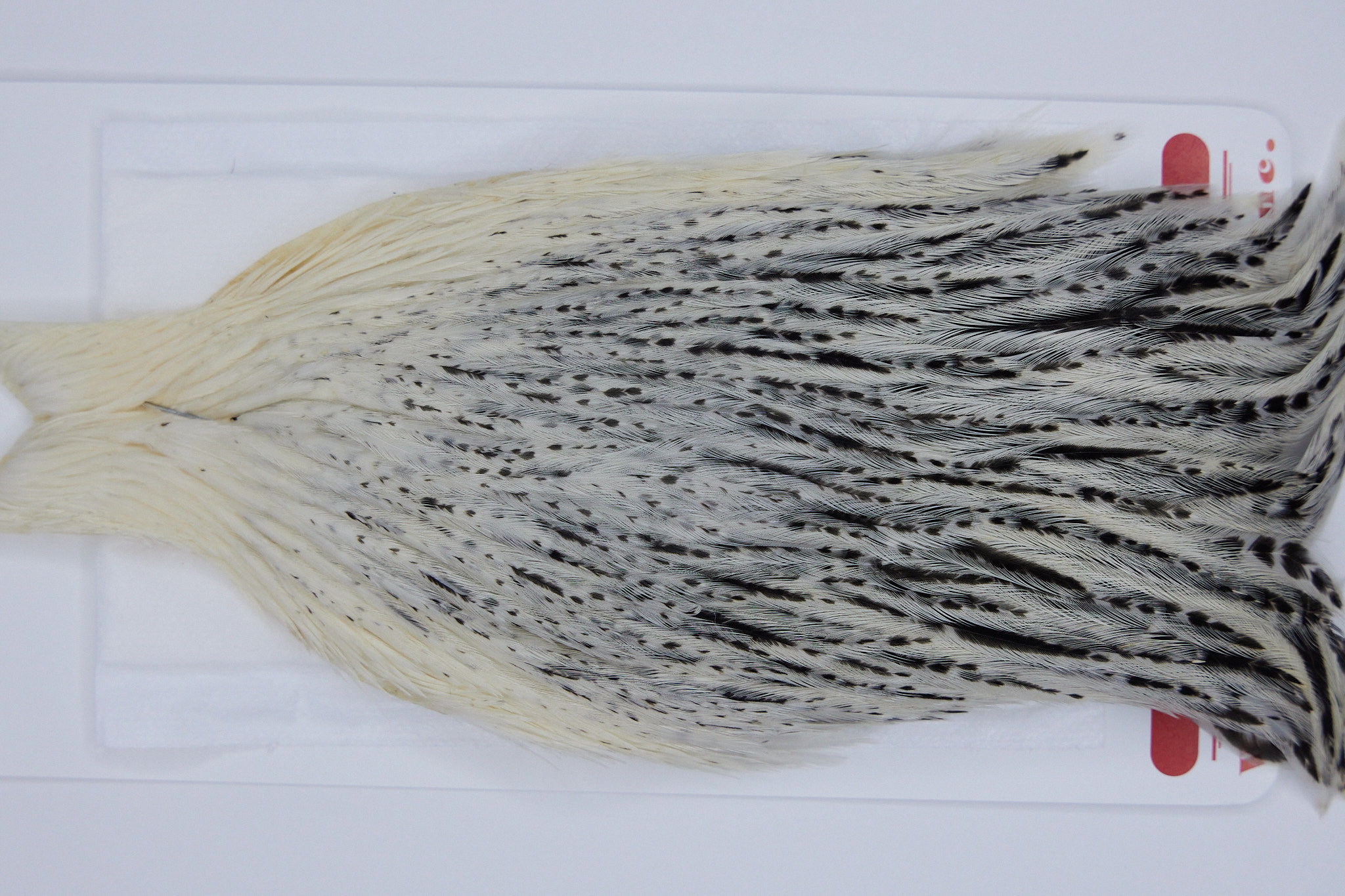 1975 is a Heritage 3 Grade Rooster Saddle of Heritage With Vermiculation color that ties predominately size 14-16. The image shown is an actual photo of this dry fly saddle. This is NEW UNUSED HACKLE.