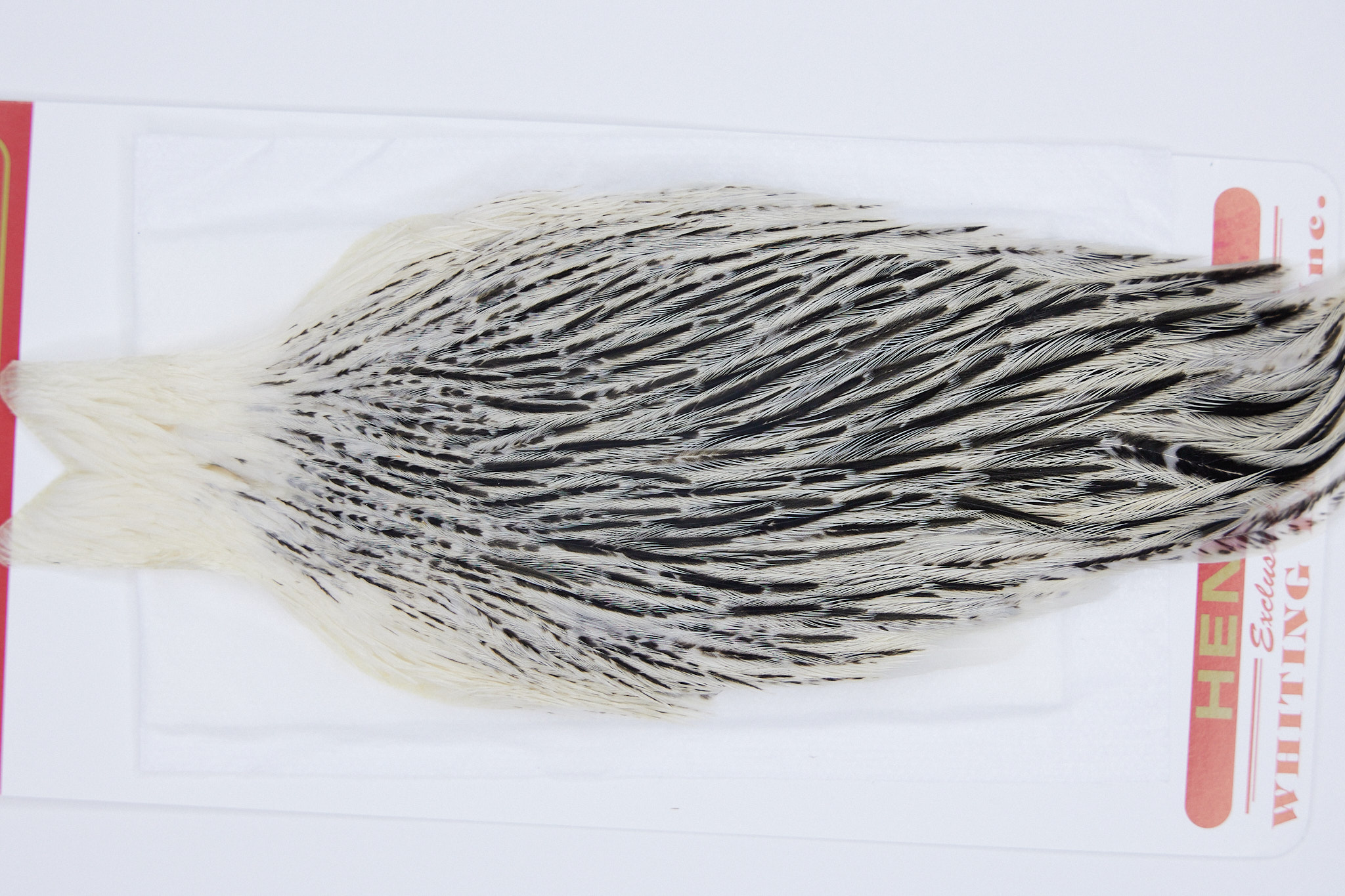 1975 is a Heritage 3 Grade Rooster Saddle of Heritage With Vermiculation color that ties predominately size 14-16. The image shown is an actual photo of this dry fly saddle. This is NEW UNUSED HACKLE.