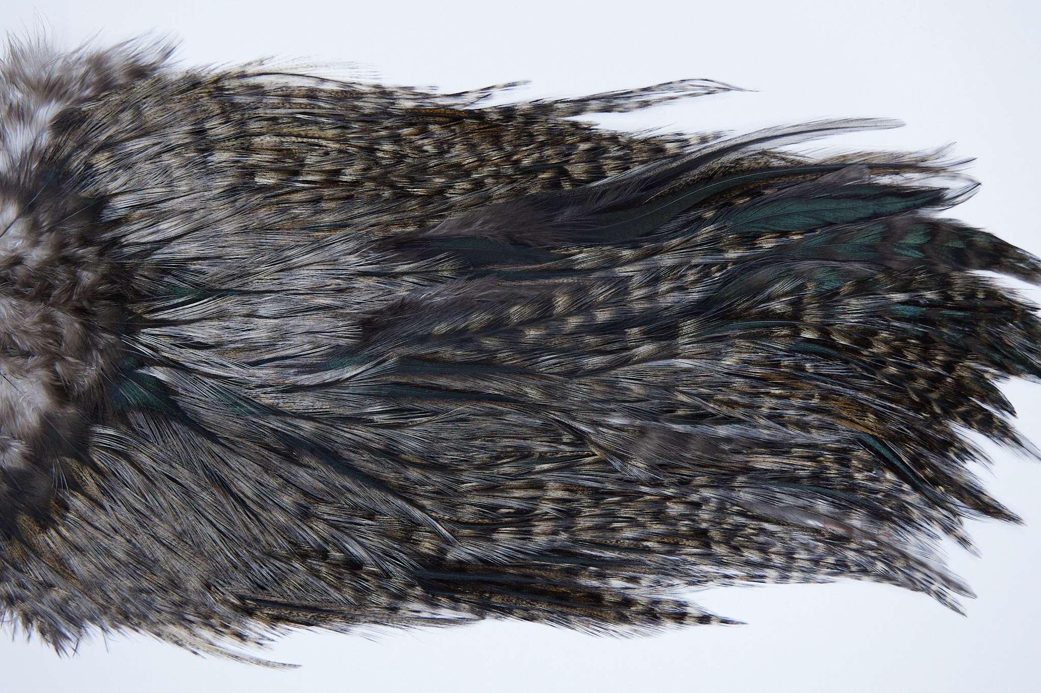 3060 is a Coq De Leon Bronze Grade Rooster Cape of Grizzly Variant color that ties predominately size None. The image shown is an actual photo of this dry fly saddle. This is NEW UNUSED HACKLE.
