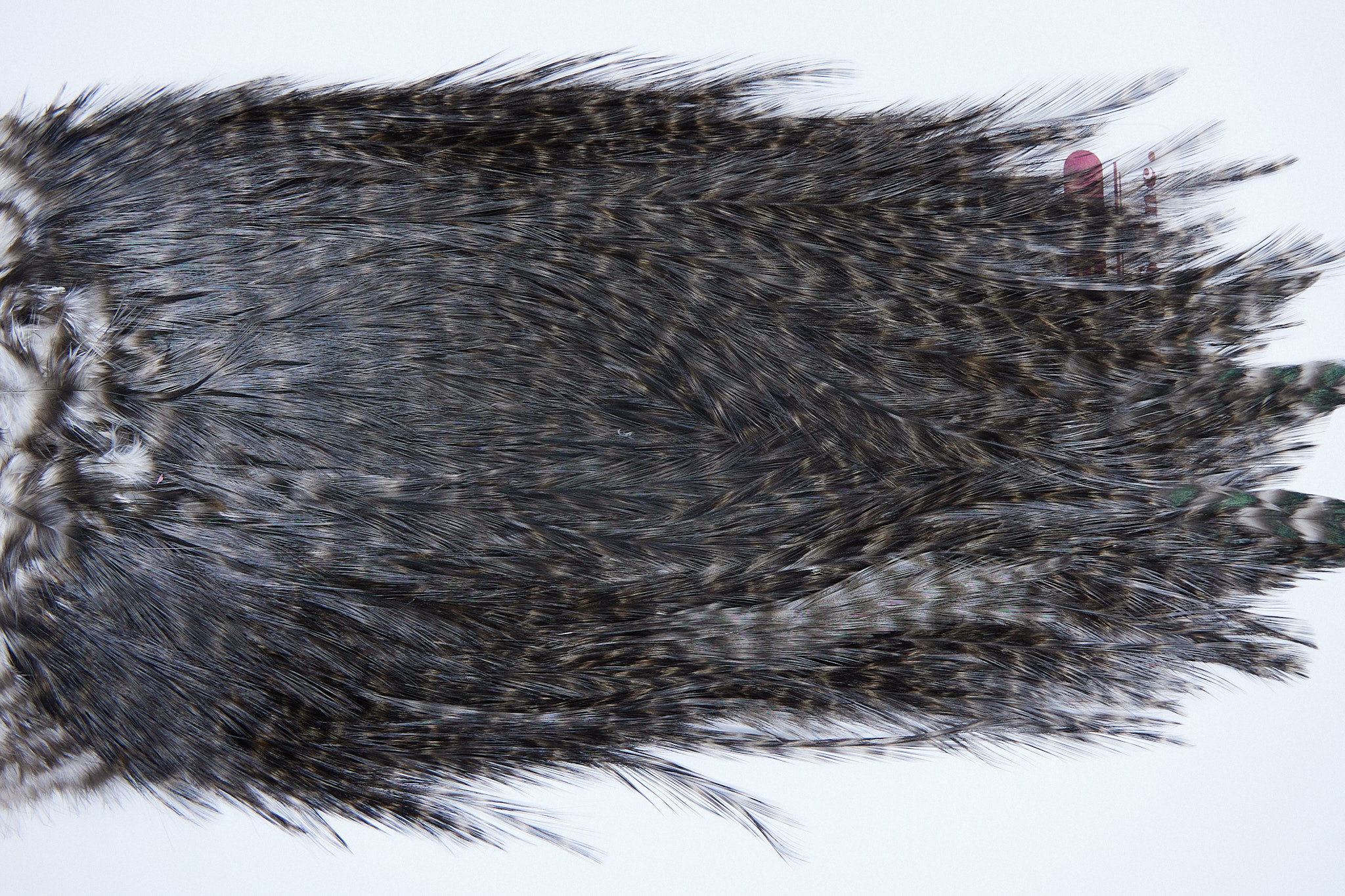 3062 is a Coq De Leon Bronze Grade Rooster Cape of Grizzly Variant color that ties predominately size None. The image shown is an actual photo of this dry fly saddle. This is NEW UNUSED HACKLE.