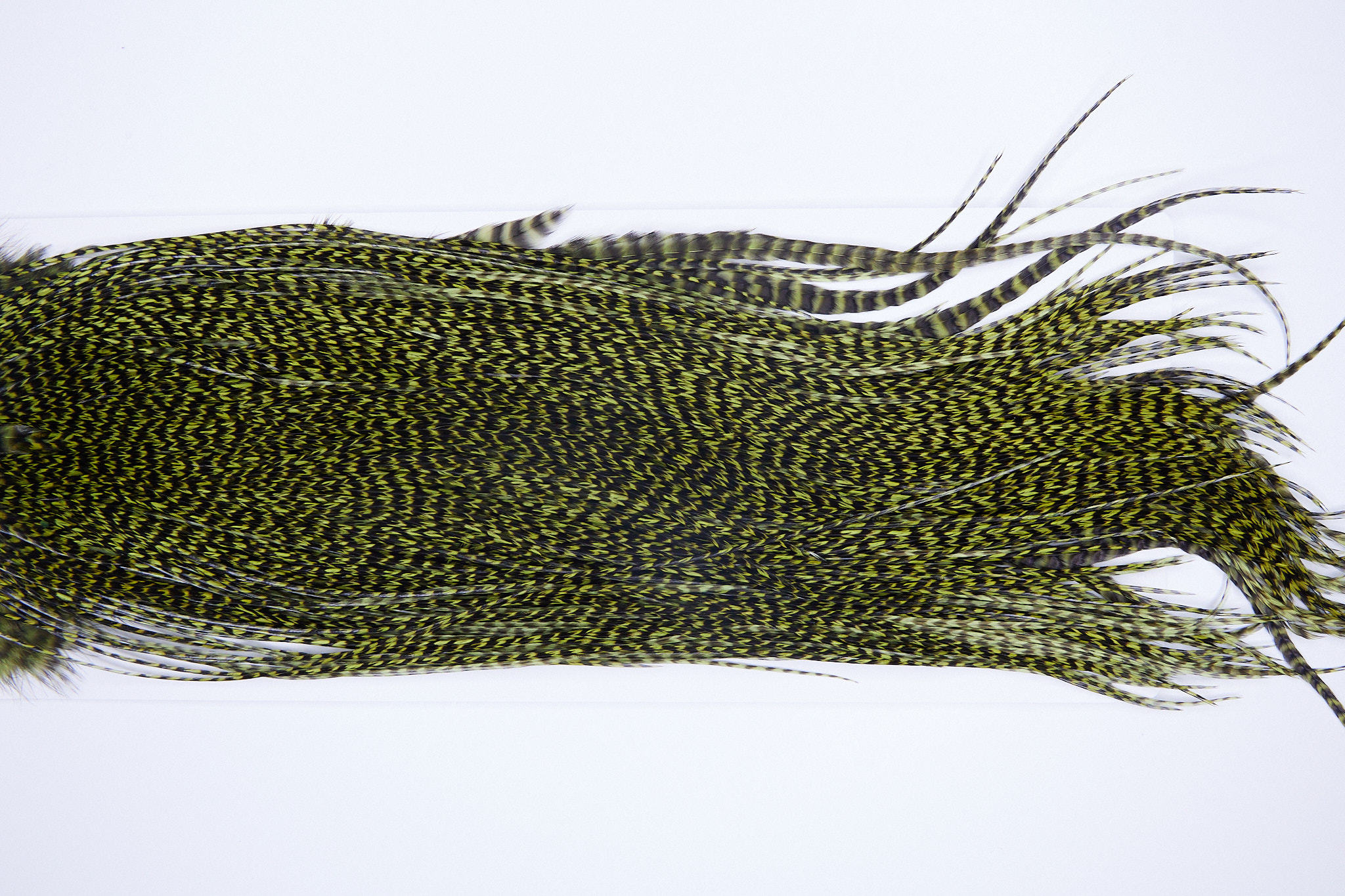 3276 is a Whiting Bronze Grade Rooster Saddle of Grizzly Olive color that ties predominately size 14-16. The image shown is an actual photo of this dry fly saddle. This is NEW UNUSED HACKLE.