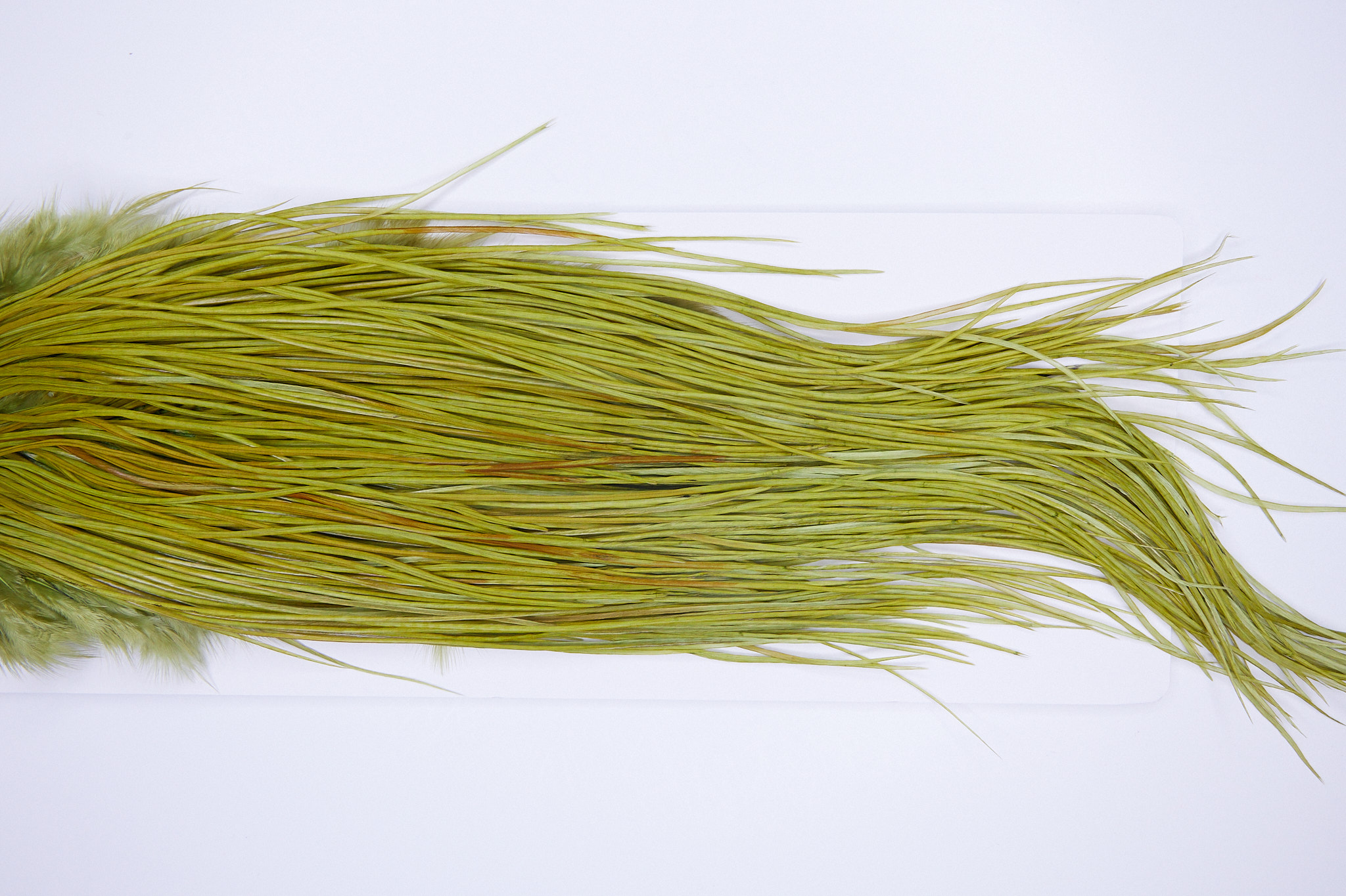 3280 is a Whiting Bronze Grade Rooster Saddle of Olive color that ties predominately size 14-16. The image shown is an actual photo of this dry fly saddle. This is NEW UNUSED HACKLE.