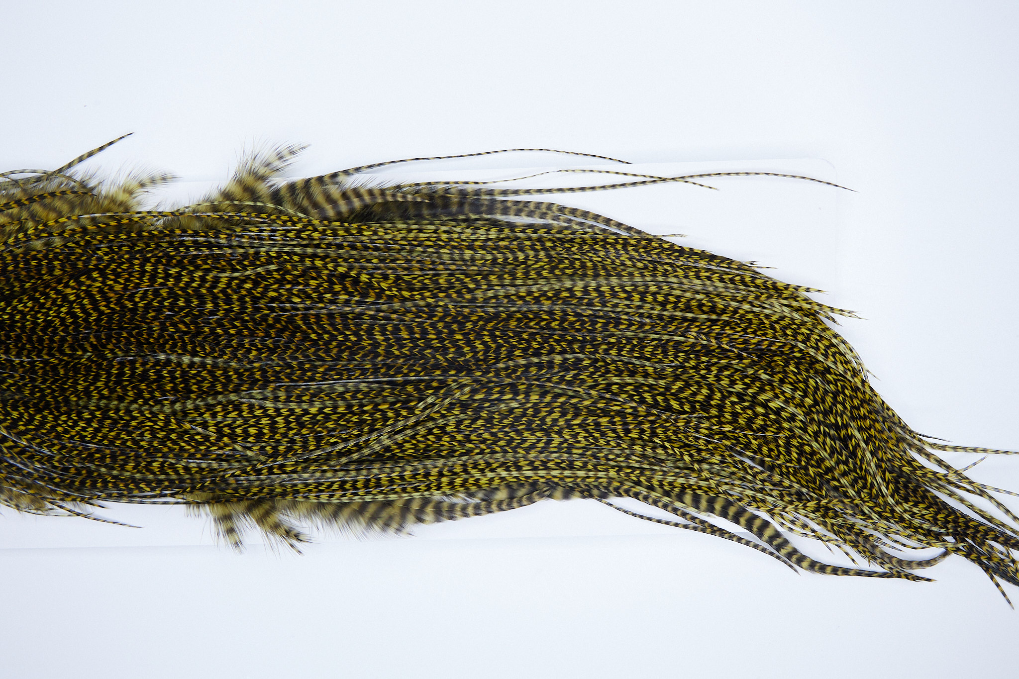 3292 is a Whiting Bronze Grade Rooster Saddle of Grizzly Golden Olive color that ties predominately size 14-18. The image shown is an actual photo of this dry fly saddle. This is NEW UNUSED HACKLE.