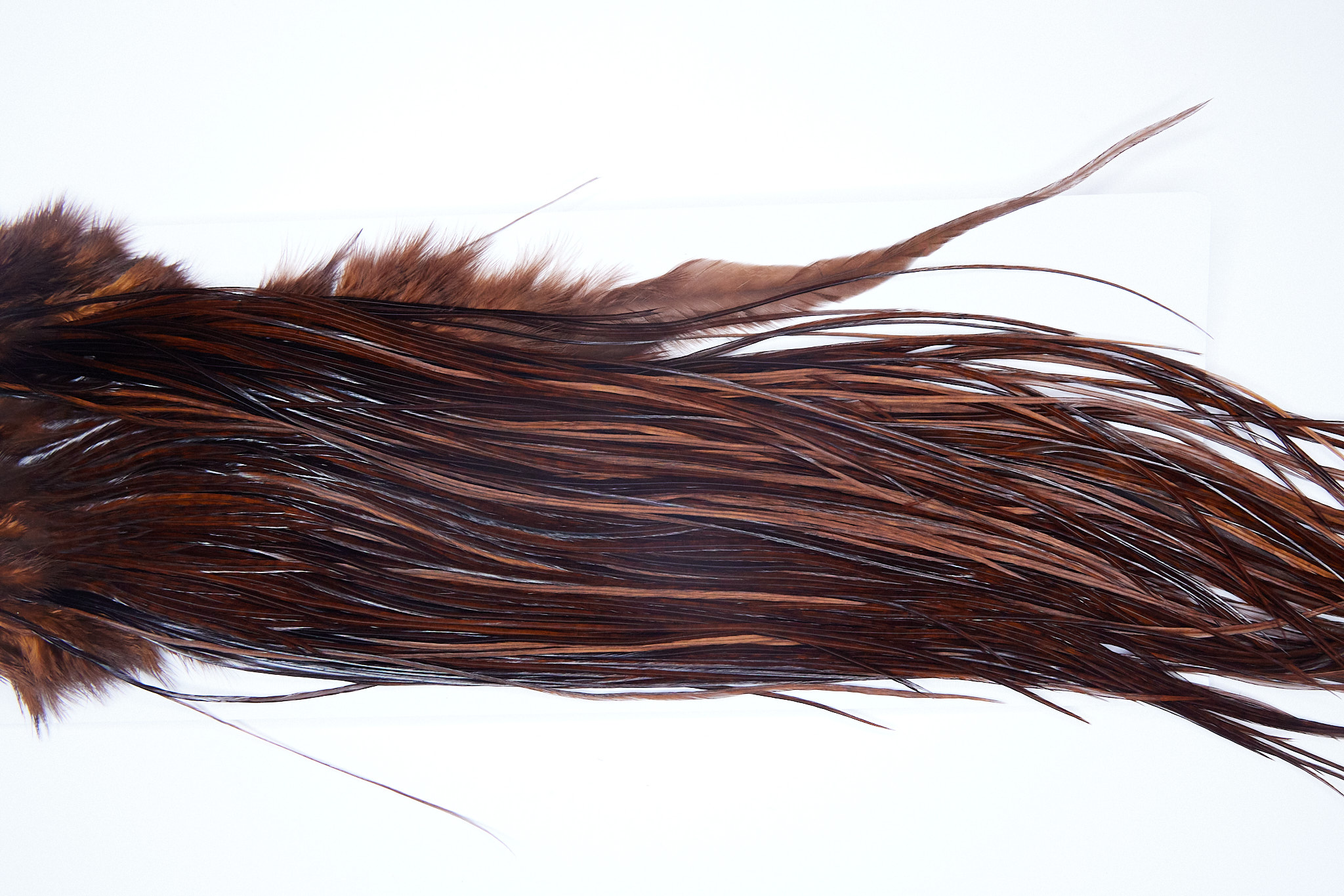 3989 is a Hebert Minor Bronze Grade Rooster Saddle of Coachman Brown color that ties predominately size 12-14. The image shown is an actual photo of this dry fly saddle. This is NEW UNUSED HACKLE.
