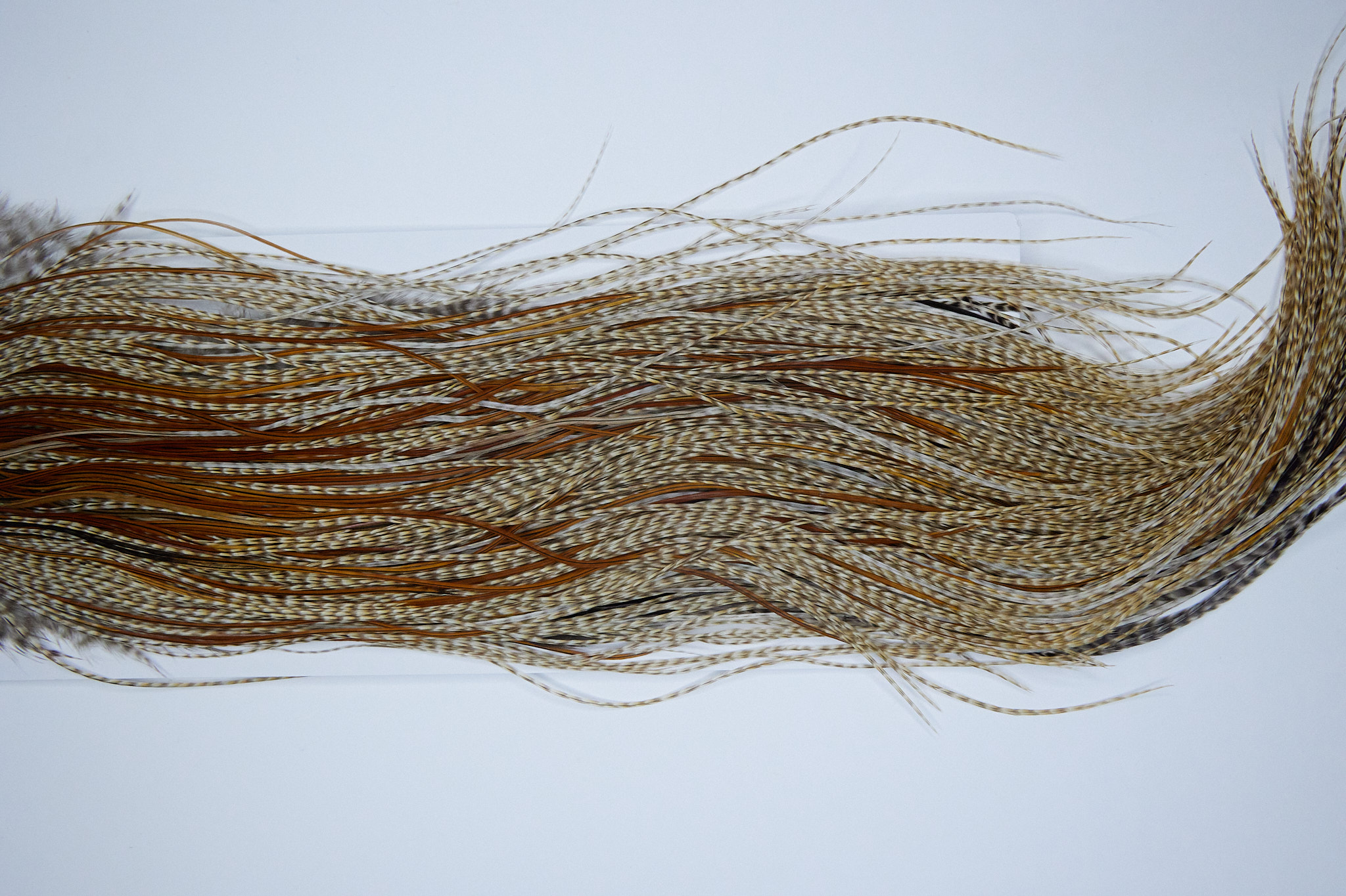4016 is a Hebert Minor Silver Grade Rooster Saddle of Medium Barred Ginger color that ties predominately size 14-18. The image shown is an actual photo of this dry fly saddle. This is NEW UNUSED HACKLE.