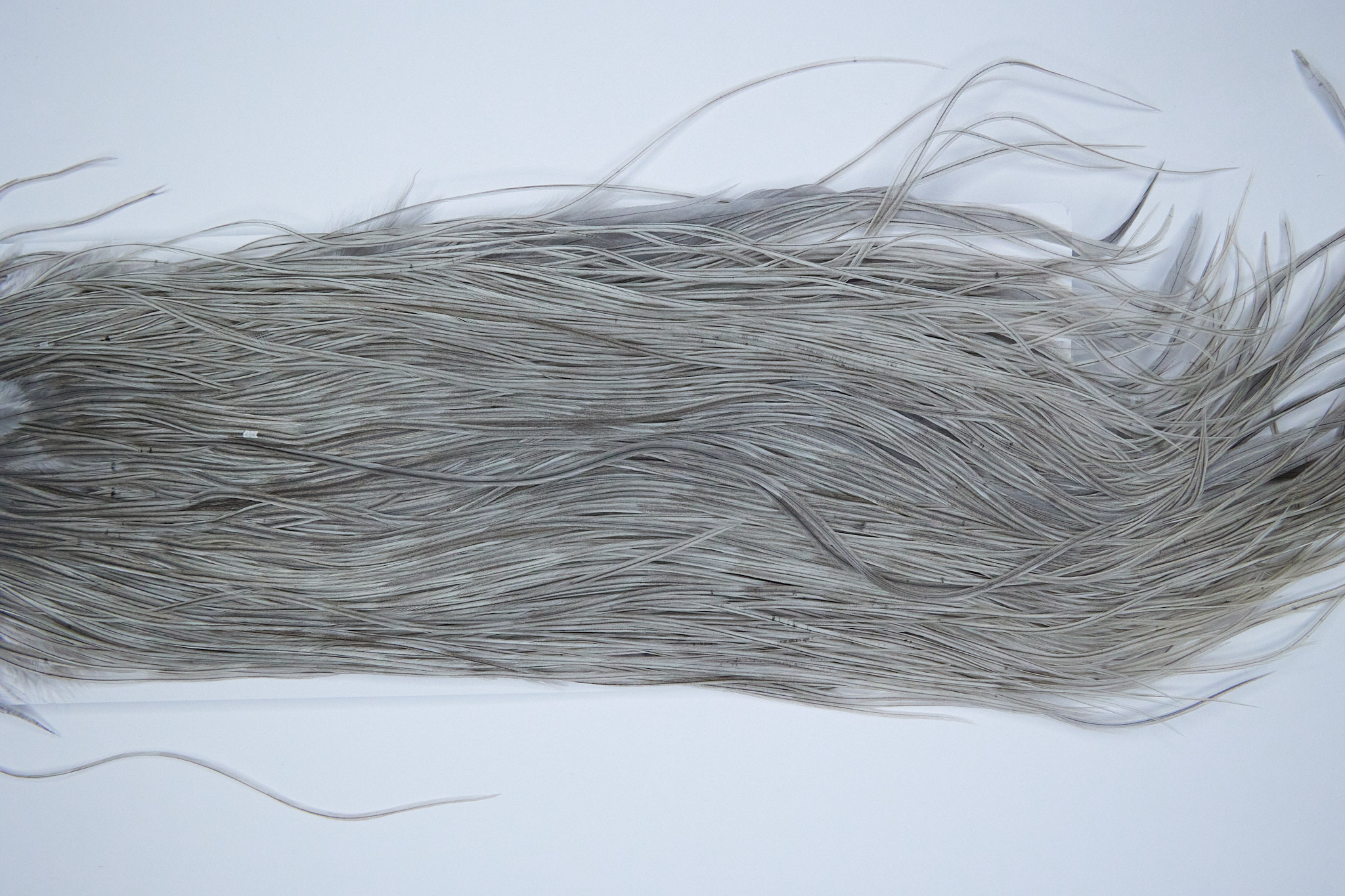 4018 is a Hebert Minor Silver Grade Rooster Saddle of Light Grey Dun color that ties predominately size 14-16. The image shown is an actual photo of this dry fly saddle. This is NEW UNUSED HACKLE.