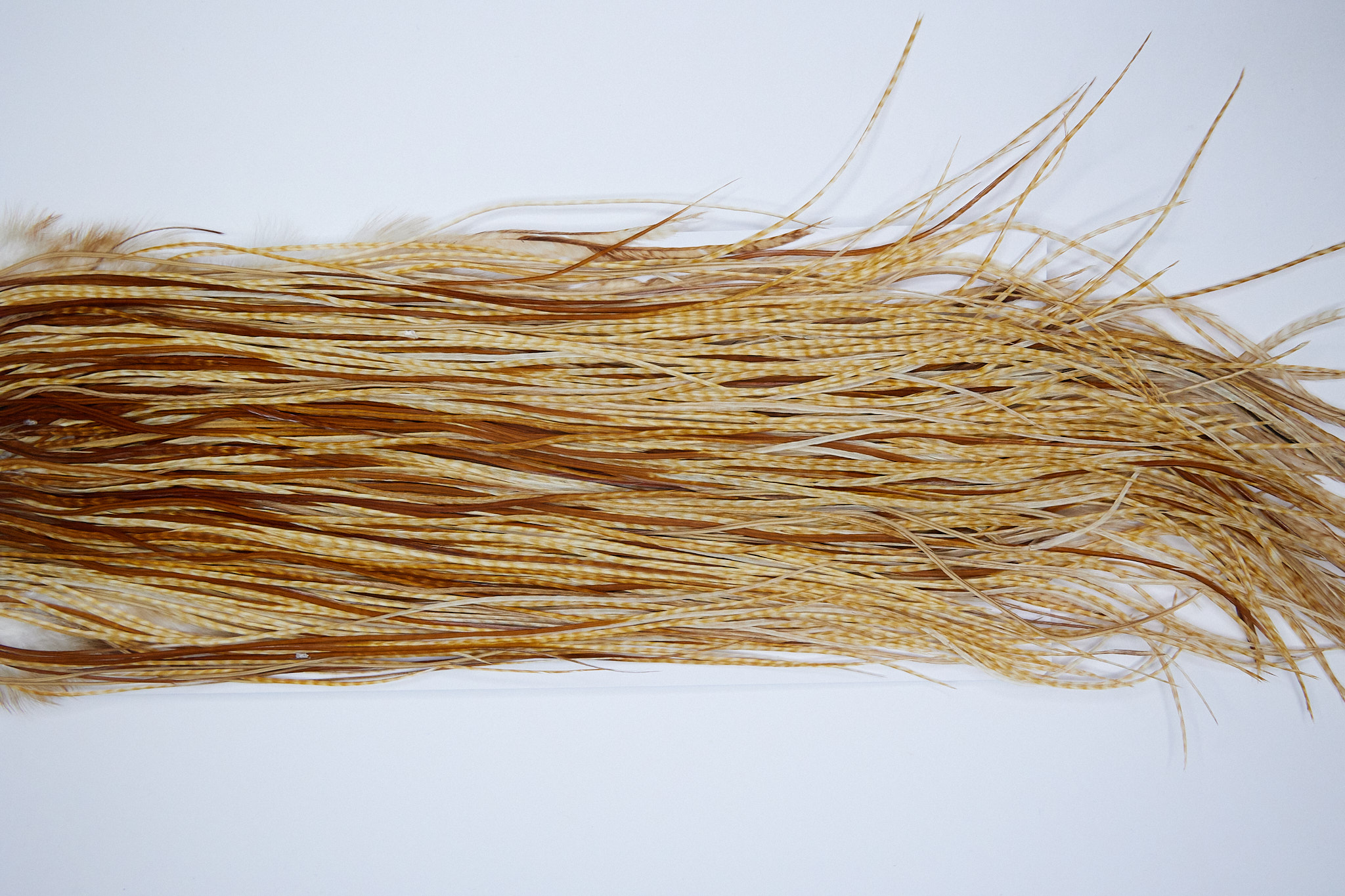 4095 is a Whiting Bronze Grade Rooster Saddle of Barred Medium Ginger color that ties predominately size 14-18. The image shown is an actual photo of this dry fly saddle. This is NEW UNUSED HACKLE.