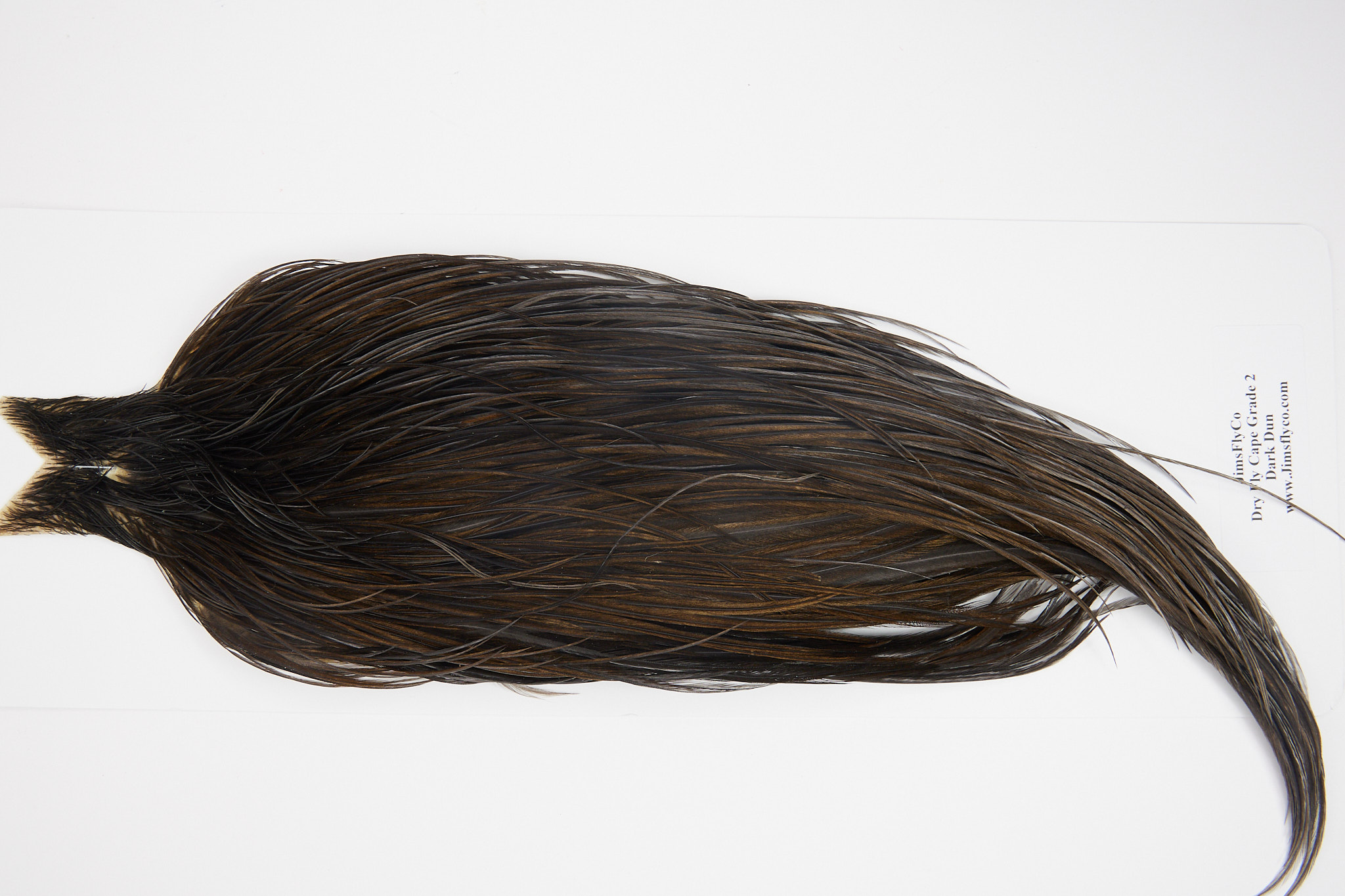 4306is a JimsFlyCo Grade 2 Dry Fly Rooster Hackle Cape of Dark Dun color that ties predominately size 10-20. The image shown is an actual photo of this dry fly cape. This is NEW UNUSED HACKLE.