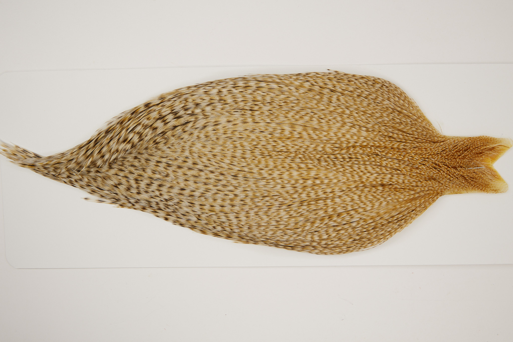 4322is a JimsFlyCo Grade 2 Rooster Cape of Barred Ginger color that ties predominately size 8-20. The image shown is an actual photo of this dry fly cape. This is NEW UNUSED HACKLE.
