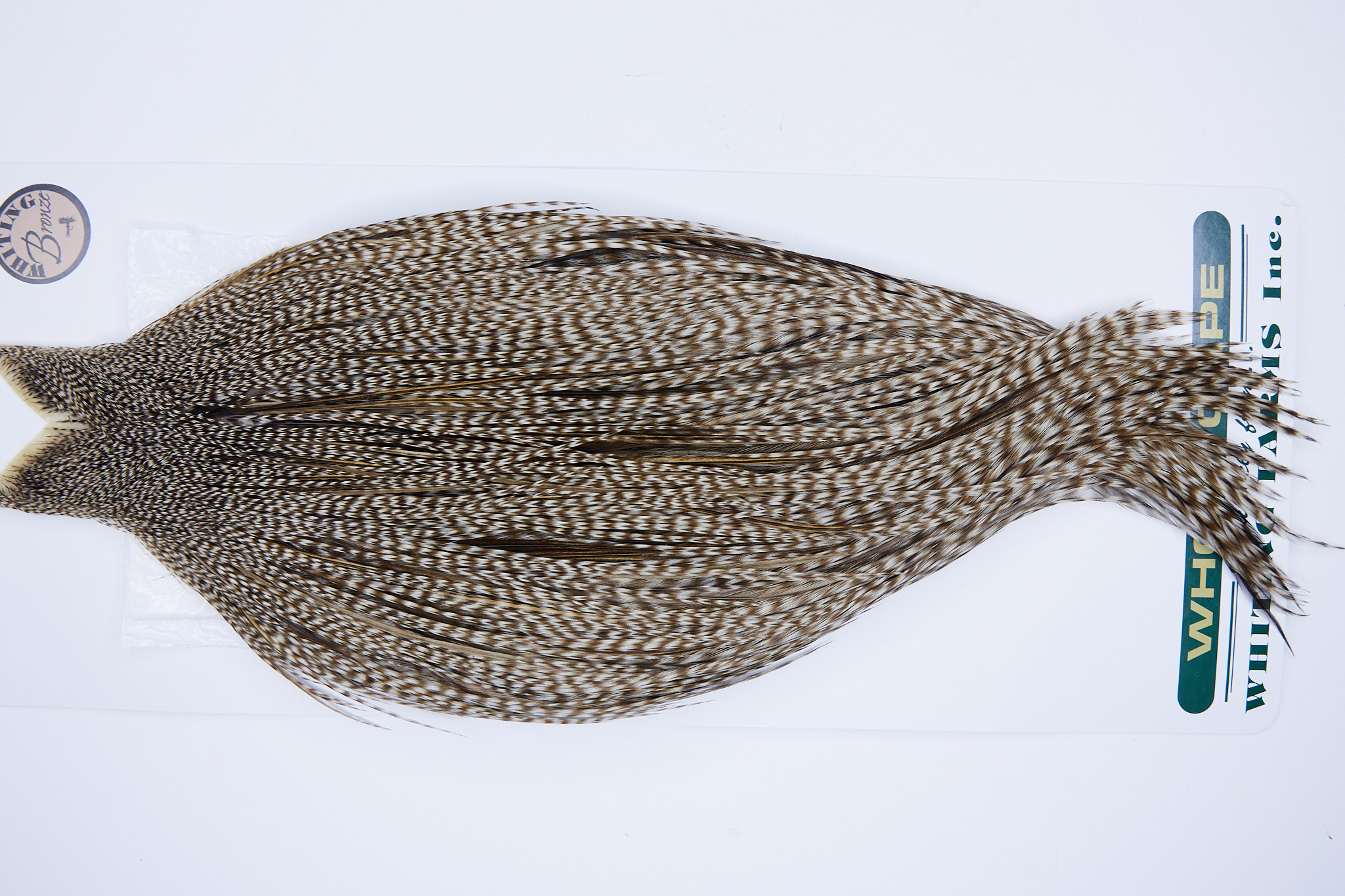 SKU 704 is a Hebert Dun Grizzly Bronze Grade Rooster Cape that ties pedominately sizes 12-20. This is a new unused pelt. The photo shown is an actual photo of this dry fly hackle. CLICK THE PHOTO FOR AN ENLARGED VIEW.