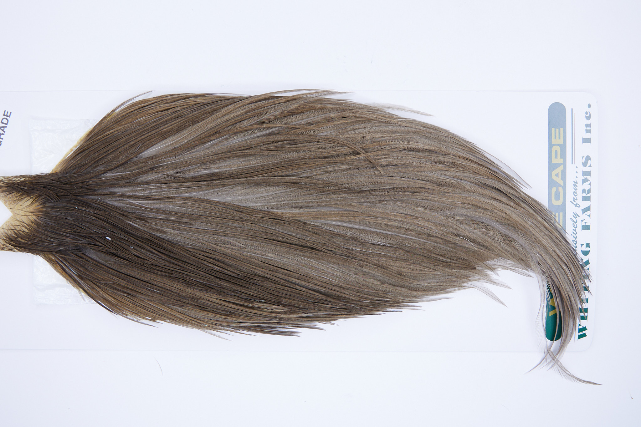 SKU 716 is a Hebert Brown Grey Dun Pro Grade Rooster Cape that ties pedominately sizes 12-22. This is a new unused pelt. The photo shown is an actual photo of this dry fly hackle. CLICK THE PHOTO FOR AN ENLARGED VIEW.