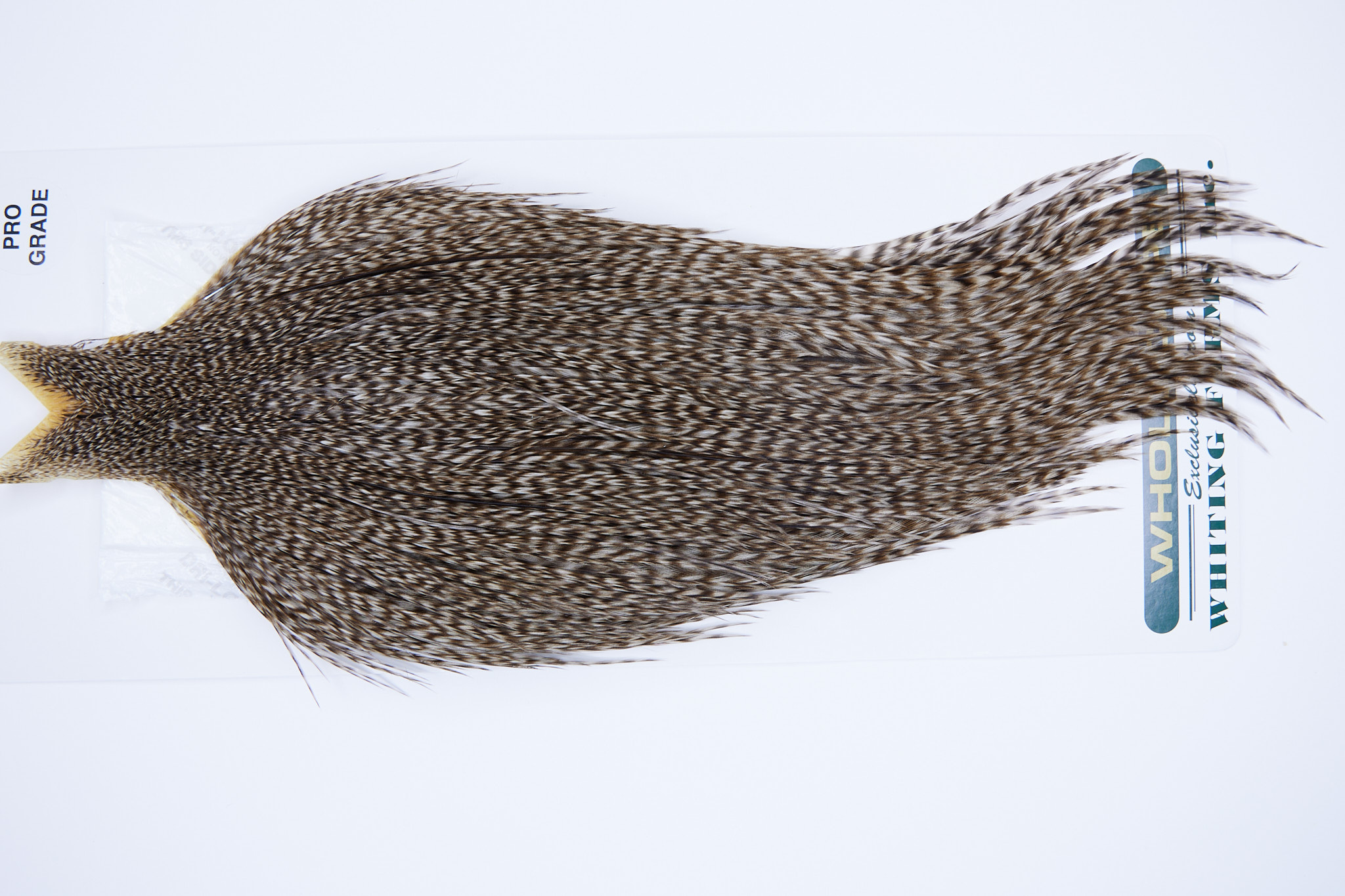 SKU 726 is a Hebert Dun Grizzly Pro Grade Rooster Cape that ties pedominately sizes 14-24. This is a new unused pelt. The photo shown is an actual photo of this dry fly hackle. CLICK THE PHOTO FOR AN ENLARGED VIEW.