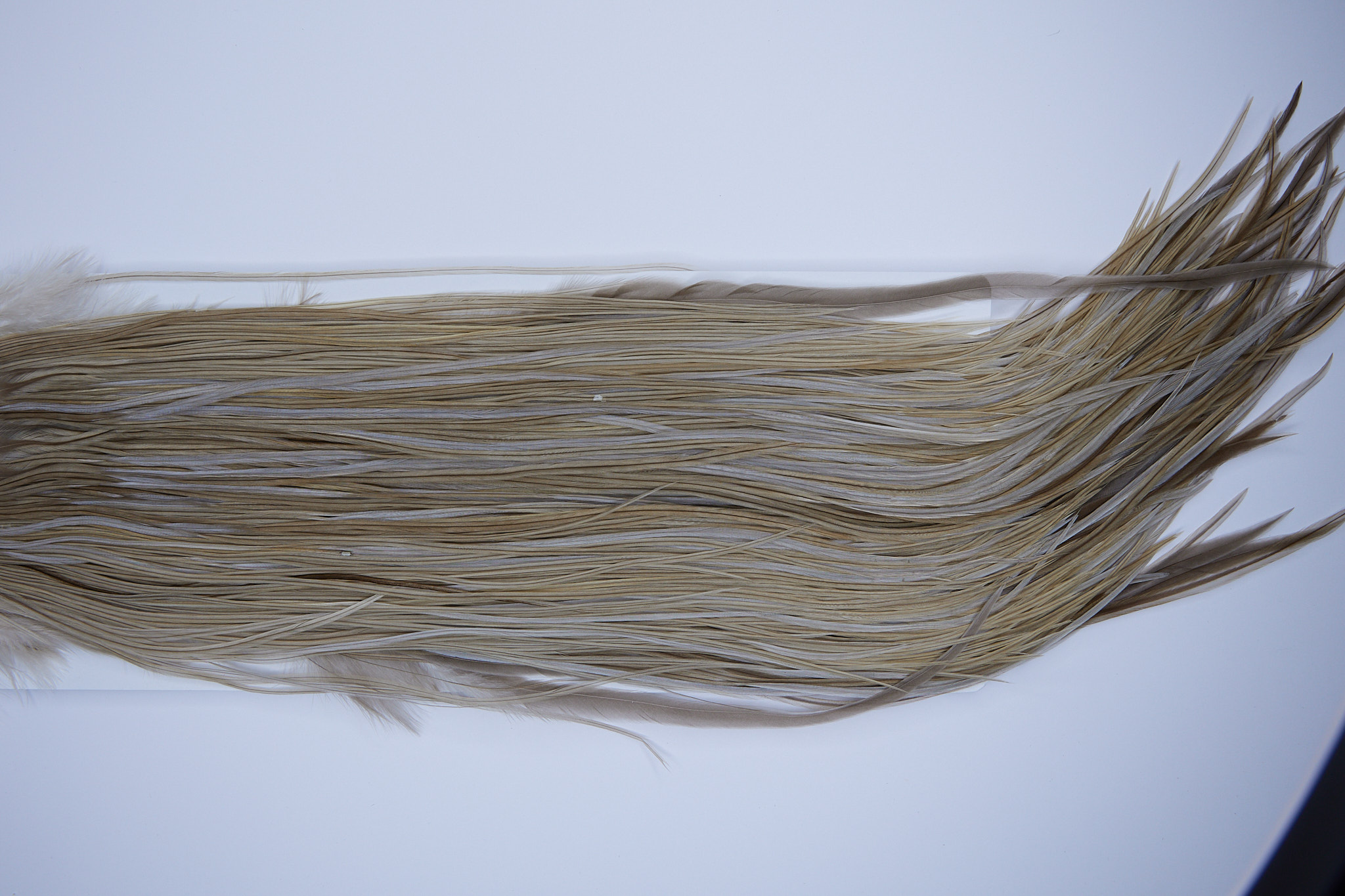 SKU 539 is a Hebert Medium Brown Dun Gold Grade Rooster Saddle that ties pedominately sizes 10-14. This is a new unused pelt. The photo shown is an actual photo of this dry fly hackle. CLICK THE PHOTO FOR AN ENLARGED VIEW.