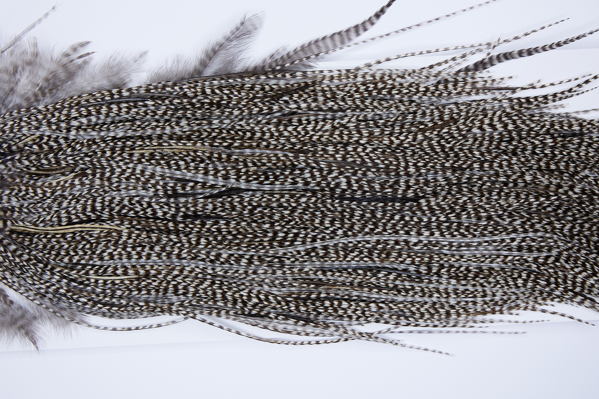 SKU 274 is a Heritage Grizzly Variant #3 Grade Rooster Saddle that ties pedominately sizes 14-16. This is a new unused pelt. The photo shown is an actual photo of this dry fly hackle. CLICK THE PHOTO FOR AN ENLARGED VIEW.