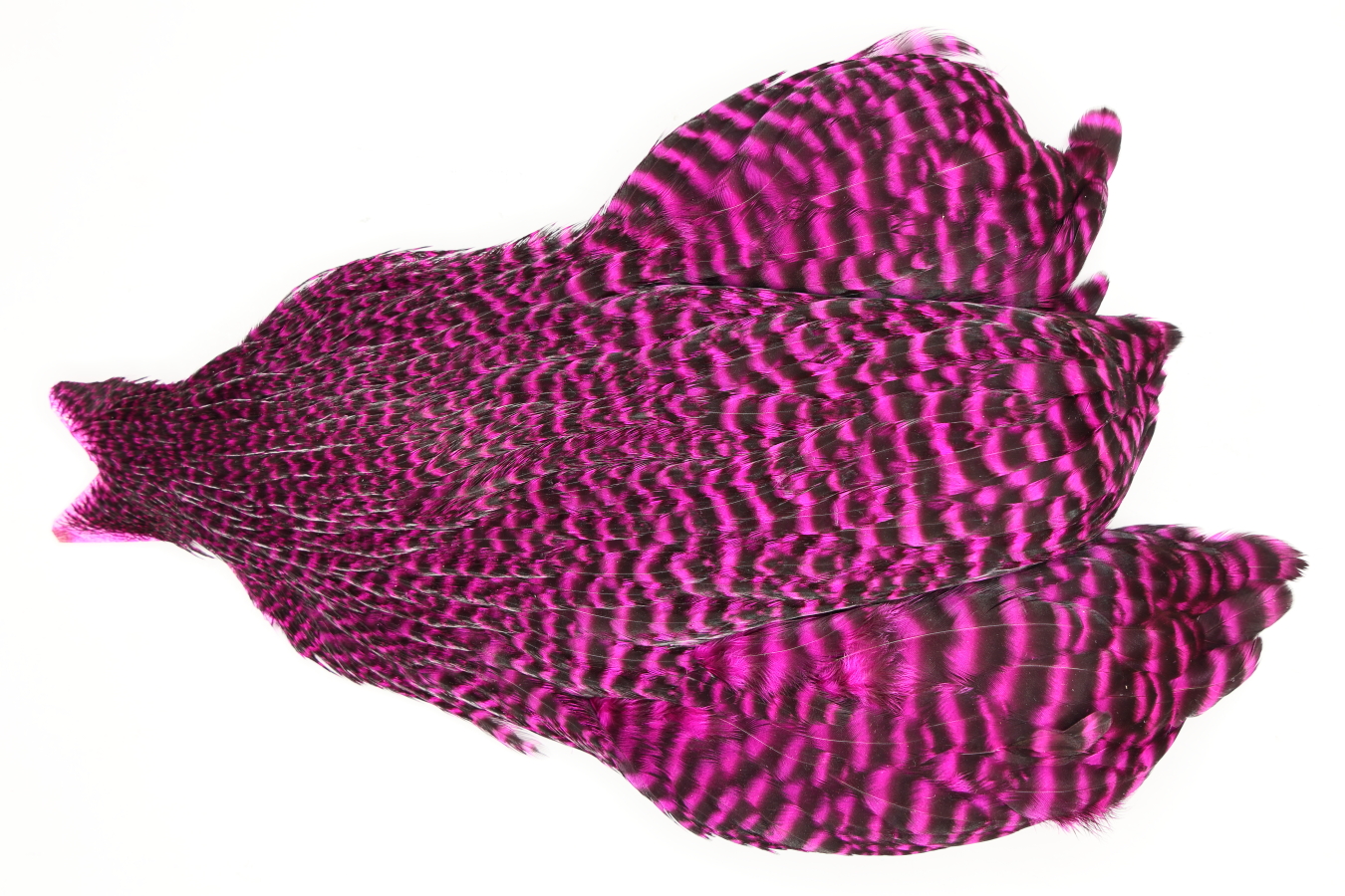 JimsFlyCo Hen Cape Grizzly dyed Magenta. This is a wet fly cape. The photos shown are the actual photos of this wet fly cape. This is a NEW UNUSED CAPE.