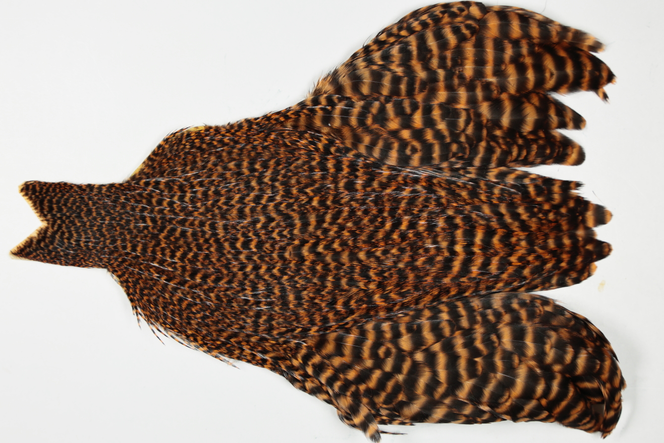 JimsFlyCo Hen Cape Grizzly dyed Ginger. This is a wet fly cape. The photos shown are the actual photos of this wet fly cape. This is a NEW UNUSED CAPE.