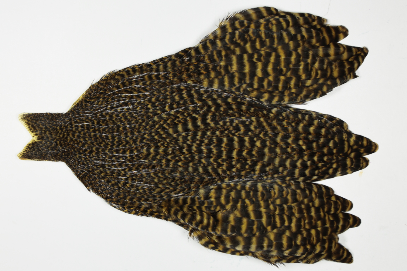 JimsFlyCo Hen Cape Grizzly dyed Golden Olive. This is a wet fly cape. The photos shown are the actual photos of this wet fly cape. This is a NEW UNUSED CAPE.
