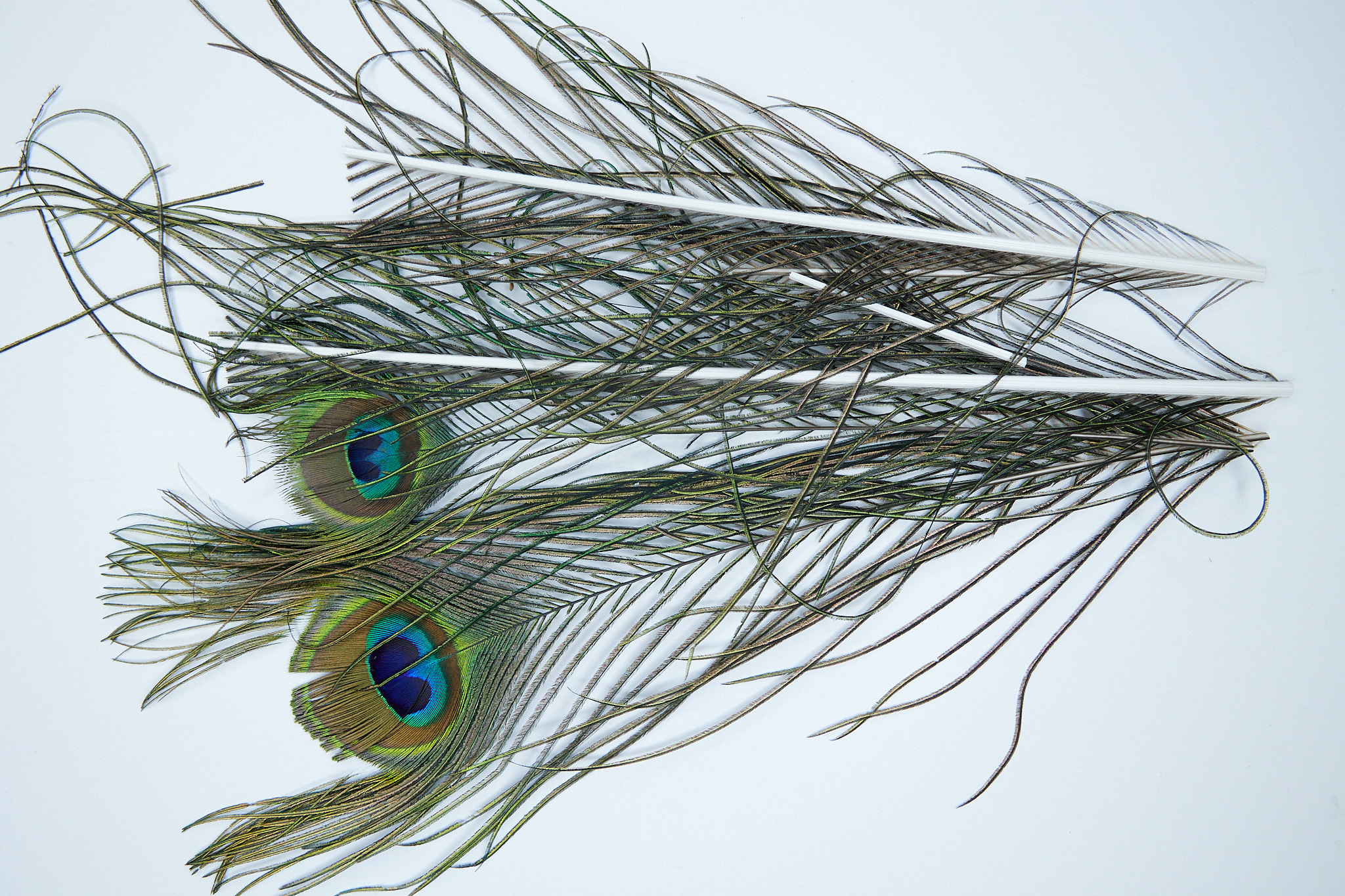 2 Entire Peacock Eye Feathers! The lower part of the feather are cut into sections to make them more bag / storage friendly. The “Blue” Peacock Eyes have a more bluish greenish overall hue to them, and therefore are more useful to tyers wanting to incorporate these colors into their patterns.