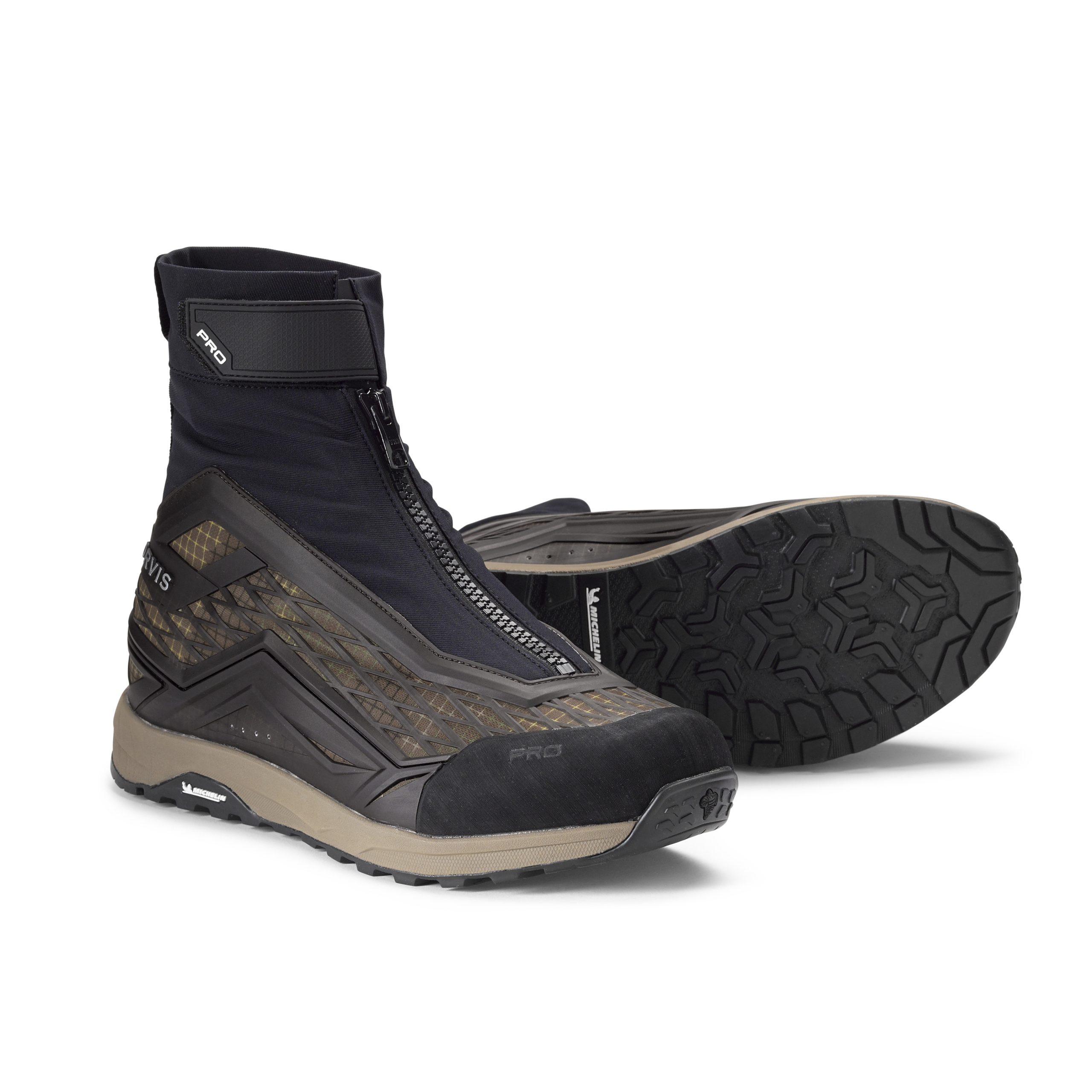The ultimate wet-wading boot made to go the distance, our popular PRO Approach Shoe morphs into a trail-inspired form in the mid-height PRO Approach Hiker. Offering blue liners with generous ankle support needed to cover miles of ground quickly and safely, it’s built with an Intuition®-based foam footbed that molds around your foot for a custom fit unlike any other wet-wading shoe ever designed. Featuring the same exclusive Michelin® outsole as our PRO Wading boots, the Approach Hiker delivers superior wet and dry traction on slick rocks and gravel. The built-in, updated zippered gravel guard with hook-and-loop closures and lace-up interior gives you the best fit possible, and makes a separate set of wading socks unnecessary unless you’re battling cool water temperatures. An EVA midsole with soft liner protects against hot spots. PU cast exterior with a scratch rubber toe for next-level abrasion resistance. Easy-grab heel loops on lace cover and liner heel help you suit up and get to the water quickly. Non-marking black outsole.